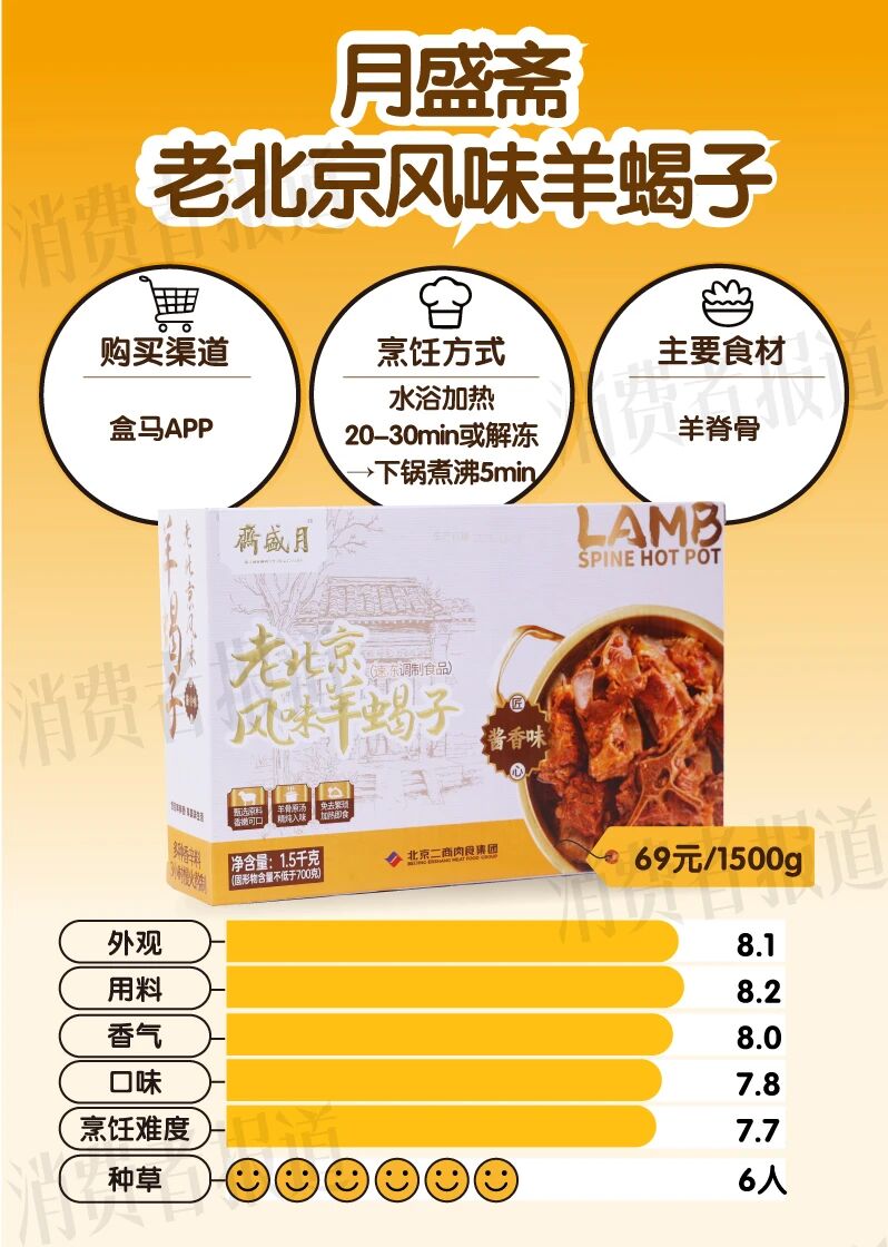 消费者对这道老北京风味羊蝎子的评价,可以概括为“香浓入味,性价比高”。诗意狗表示,“价格实惠,性价比高,肉还挺多”;妙音咪子认为,“经典的老北京风味。羊蝎子酥烂入味,轻松脱骨,肉质不柴。汤底调味咸香适中,微辣,香料味浓郁传统”;杨M认为,“这个菜对手工现制风味的还原度比较高”;麦麦表示,“这个还蛮香的,羊肉味十足”。