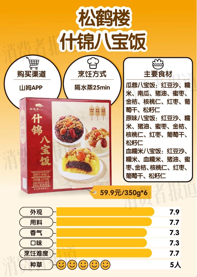 有必要说明的是,根据2月6日国家卫生健康委发布的《食品安全国家标准 预制菜》(征求意见稿),本次测评中的“松鹤楼什锦八宝饭”属于主食类,严格来说并非标准意义上的预制菜。但为了便于整体呈现与比较,本次测评暂不作严格区分,一并纳入讨论。