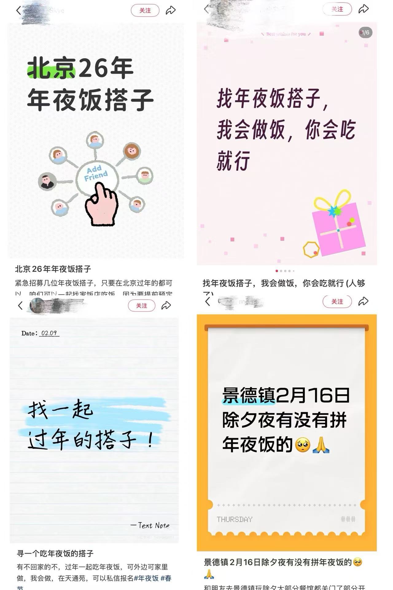 不止大山和杰瑞,社交平台上,“想找几个会做饭的朋友凑一桌除夕年夜饭”“急招年夜饭搭子,AA制,主打热闹不尴尬”的内容并不少。在小红书一个“饭搭子”社群,年夜饭拼单局总能一呼百应。