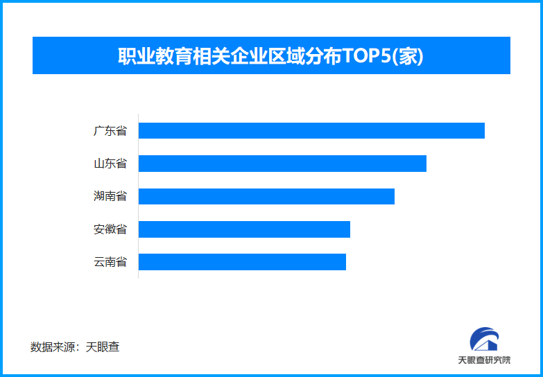 天眼查专业版数据显示,截至目前我国现存在业、存续状态的职业教育相关企业超1万家。从区域分布来看,广东省、山东省、湖南省职业教育相关企业数量位居前列,分别拥有超1100余家、950余家和840余家。