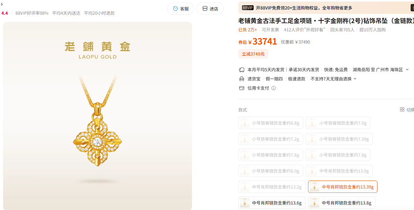 据了解,老铺黄金内的足金饰品类多样,包括搭配珐琅、镶嵌钻石或宝石等多种款式。记者注意到,老铺黄金旗舰店内比较热销的一款“老铺黄金古法手工足金项链·十字金刚杵(2号)钻饰吊坠(金链款)”,产品页面显示,其含有钻石,金重13.39g。售价33741元的这款金饰,使用了古法手工錾刻、镶嵌工艺打制。