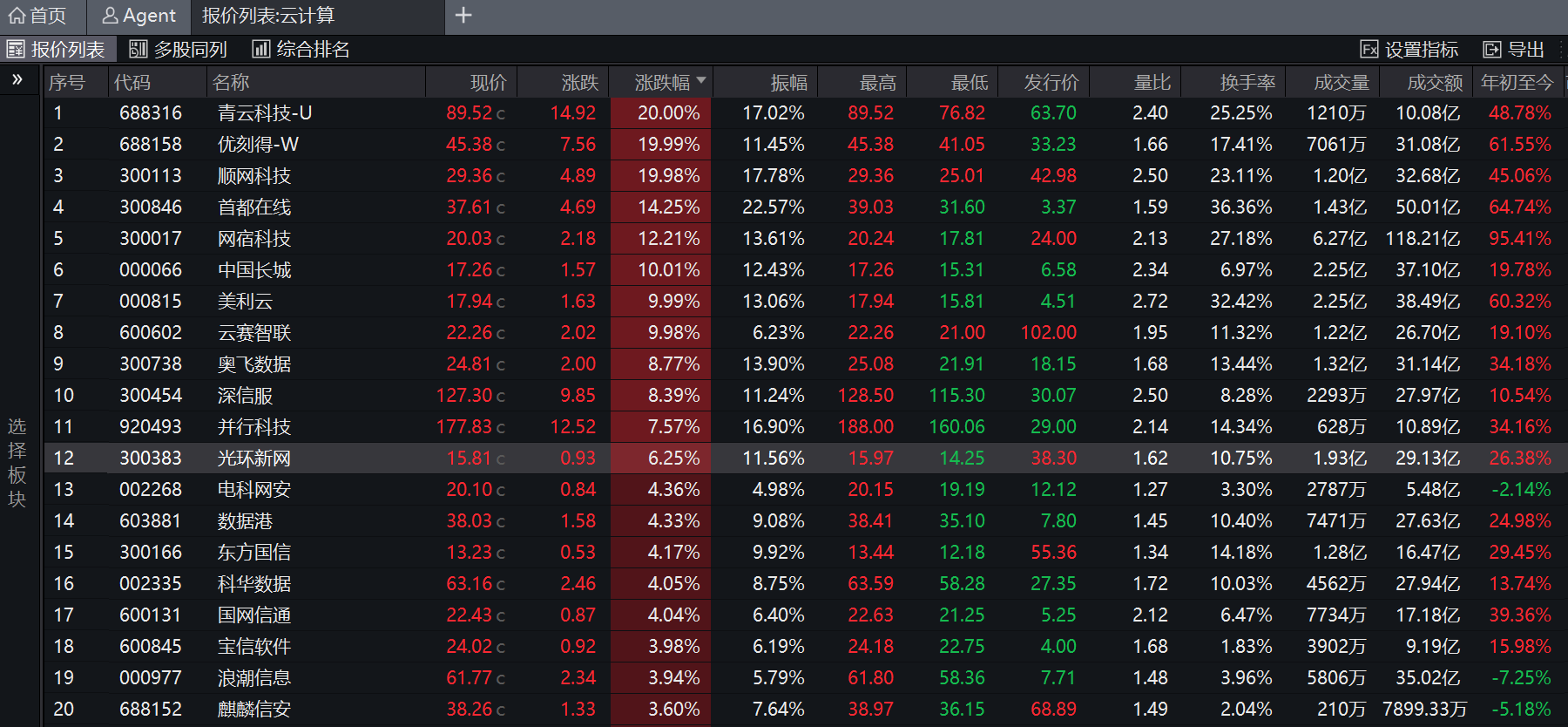 截至收盘,青云科技(688316.SH)、优刻得(688158.SH)、顺网科技(300113.SZ)“20cm”涨停,中国长城(000066.SZ)、美利云(000815.SZ)、云赛智联(600602.SH)、拓维信息(002261.SZ)、智微智能(001339.SZ)“10cm”涨停,两个板块涨停个股达到8只。此外,首都在线(300846.SZ)、网宿科技(300017.SZ)涨超10%。