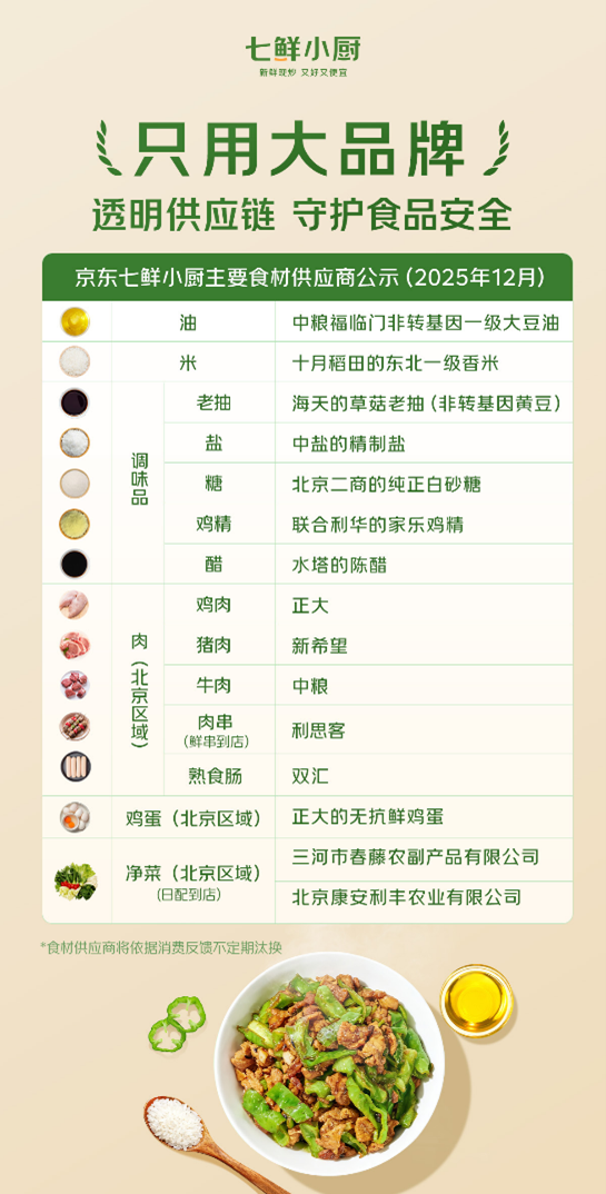 在食材选择上,七鲜小厨从源头严把质量关,主动公开核心供应商清单,全部选用行业头部品牌:食用油采用福临门非转基因大豆油,大米选用十月稻田东北一级大米,肉禽蛋奶锁定正大集团等知名企业,从源头保障菜品安全。所有蔬菜均为优质净菜,每日冷链配送到店,主打新鲜现炒,让老人吃到真正的“锅气”。同时,七鲜小厨开放24小时后厨直播,老人及其子女可通过京东外卖App实时观看现炒过程,真正做到“看得见的热气,尝得到的放心”。