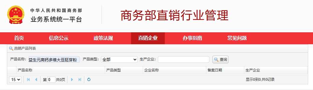 然而,《消费者报道》记者并未在隆力奇的直销产品名单中找到该款产品,在商务部直销行业管理系统中搜索“益生元高钙多维大豆胚芽粉”,也显示0条记录。这意味着其根本不具备直销资质,却被变相按照直销模式推广。