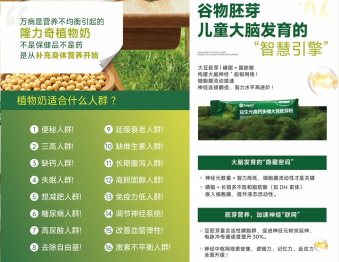 据江女士提供的内部宣传材料,内文明确将大豆胚芽粉(又称“植物奶”)的适合人群指向糖尿病、高胆固醇、长期腹泻等患者,还声称产品可调节神经系统、改善血管弹性、去除自由基、可促进儿童大脑发育,但海报中又标注产品“不是保健品不是药”。