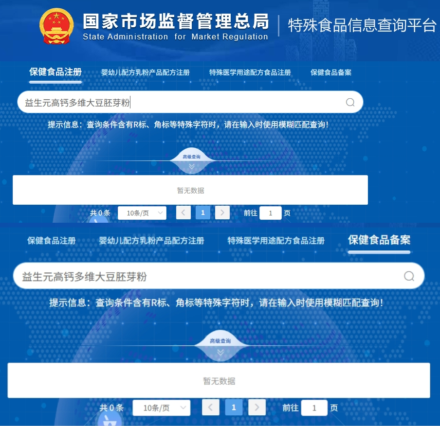 值得注意的是,在国家市场监督管理总局特殊食品信息查询平台上,记者并未查找到关于“益生元高钙多维大豆胚芽粉”的保健食品注册及备案信息。这意味着,该款被隆力奇官网标注为保健品的产品实则为普通食品。