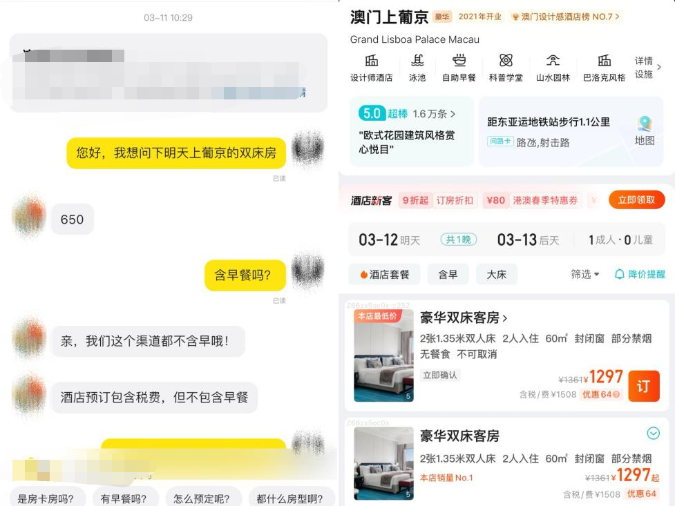 左图:记者与卖家的对话 右图:OTA平台显示的酒店房价