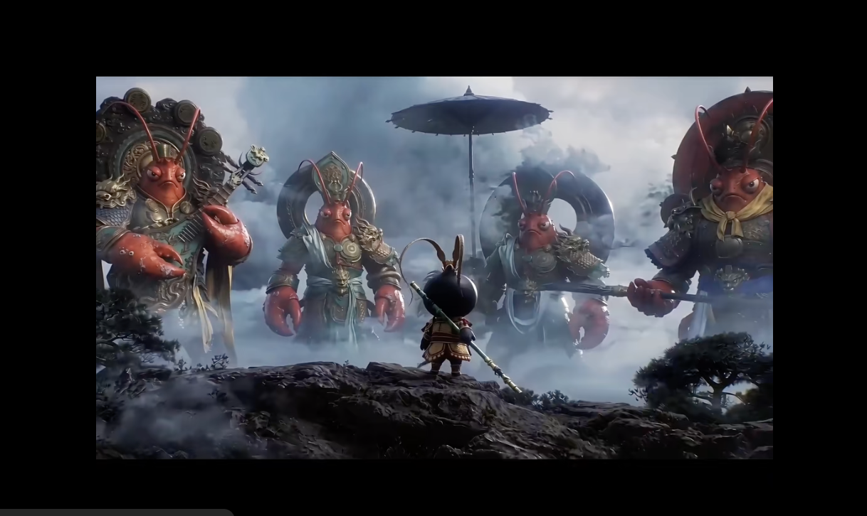 视频中,钉钉标志性的黑色吉祥物化身为手持金箍棒的孙悟空,站在山巅之上,面对四个身形巨大的“龙虾”。画面风格颇具东方神话色彩,背景云雾翻涌,气氛紧张。随后,画面定格在一句醒目的字幕——大圣归来。
