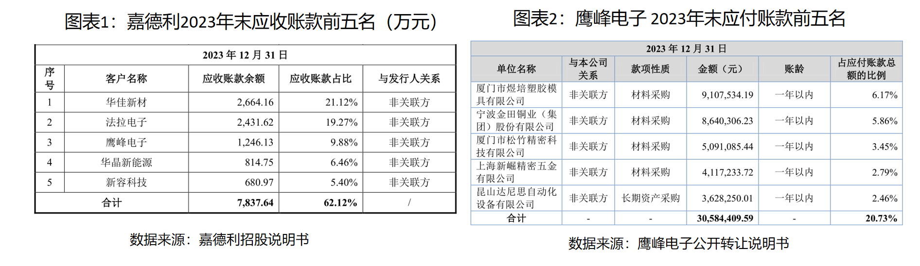 鹰峰电子于2025年3月发布的公开转让说明书显示,其2023年第一大应付账款供应商为厦门市煜培塑胶模具有限公司,应付账款金额仅为910.75万元,这一金额甚至低于嘉德利招股书中披露的“鹰峰电子当年应付嘉德利的1246.13万元”。