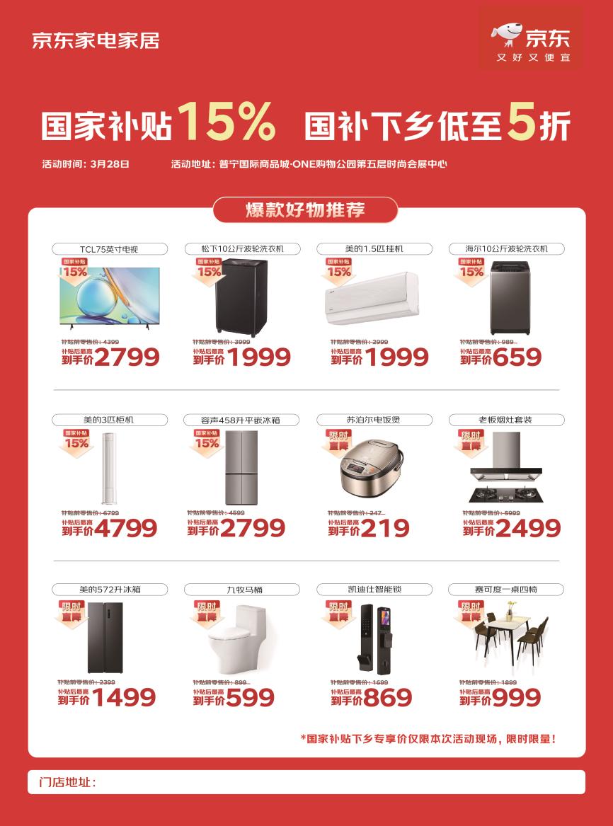 普宁的消费者记得3月28日到普宁国际商品城时尚会展中心,在京东活动现场体验产品,并享国补入手家电、3C数码好物。