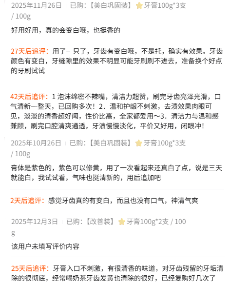 另外,记者在电商平台上各品牌“紫色牙膏”的消费评论中发现,消费者对于牙齿“变白”的效果感受各异,不少消费者表示“牙齿有变白哦”“清洁力与温和感兼顾”“看起来真白了点”……但也有部分消费者表示“刷完没有变白”“没有美白效果”。
