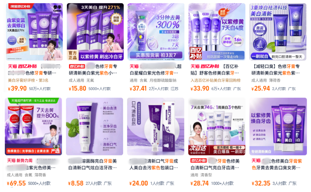 《消费者报道》记者梳理公开信息发现,早在2023年,社交平台上就涌现了对“紫色牙膏”的讨论。中研普华产业研究院《2025-2030年中国牙膏行业市场全景调研及投资价值评估研究报告》数据显示,2024年美白牙膏以32%的市场份额跃居细分品类首位,超过了抗敏和防蛀。