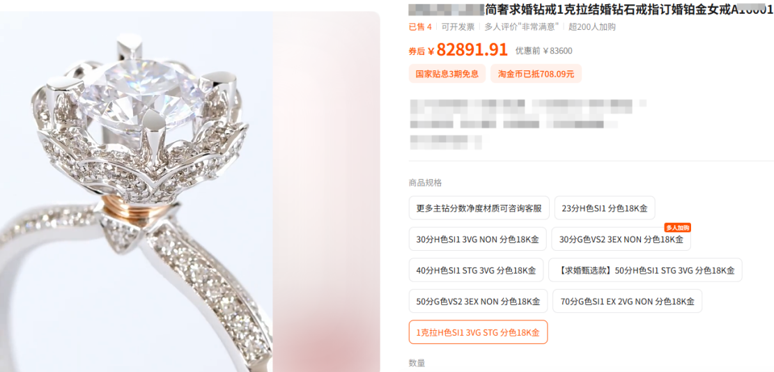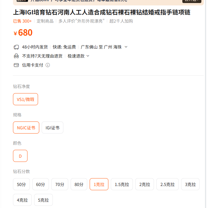 《消费者报道》记者发现,在电商平台上某店铺,1克拉培育钻石仅售680元。一位专注钻戒定制的商家也告诉记者,目前培育钻石的价格不高,1克拉钻石按级别划分,价格在几百元到一千多元不等。