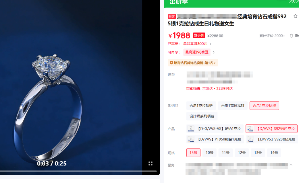 为了对比培育钻戒、天然钻戒的差价,2026年3月,《消费者报道》对电商平台上销量较大的7款培育钻石戒指、8款天然钻石戒指进行了梳理与对比,涉及蒂芙尼、DR、六福珠宝、京东京造等知名品牌。
