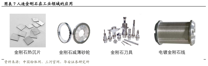 培育钻石技术成熟的另一大驱动在工业领域。华安证券指出,培育钻石作为人造金刚石,广泛应用于切割、磨削、钻孔等工艺中,特别是在石材、金属和玻璃等硬质材料的加工中占据主流地位。