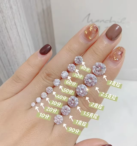 在业内,钻石等级通常通过大小、颜色、净度、切工这四个维度来判断。上文的“克拉”指的就是钻石重量大小,1克拉(ct)=100分=0.2克,同规格的钻石越大越珍贵。
