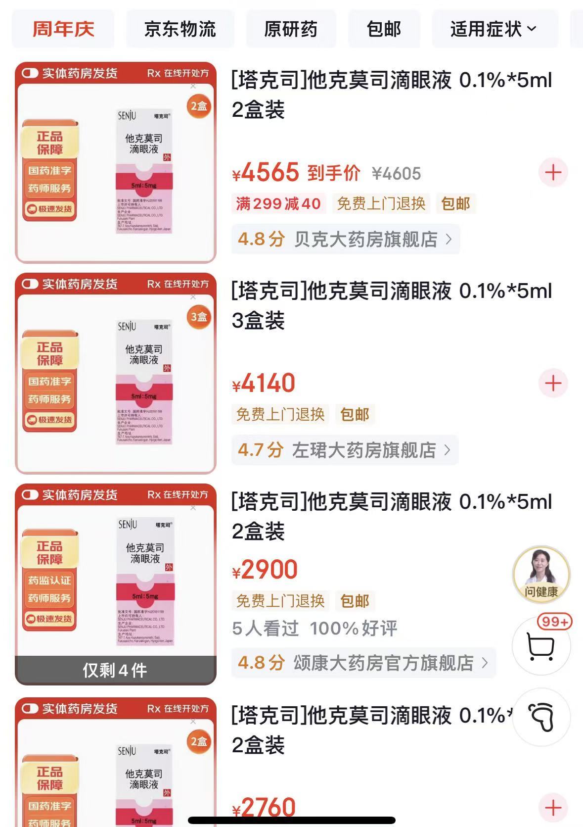 当前,各大平台在售的他克莫司滴眼液价格均低于此前媒体报道中的两三千元。