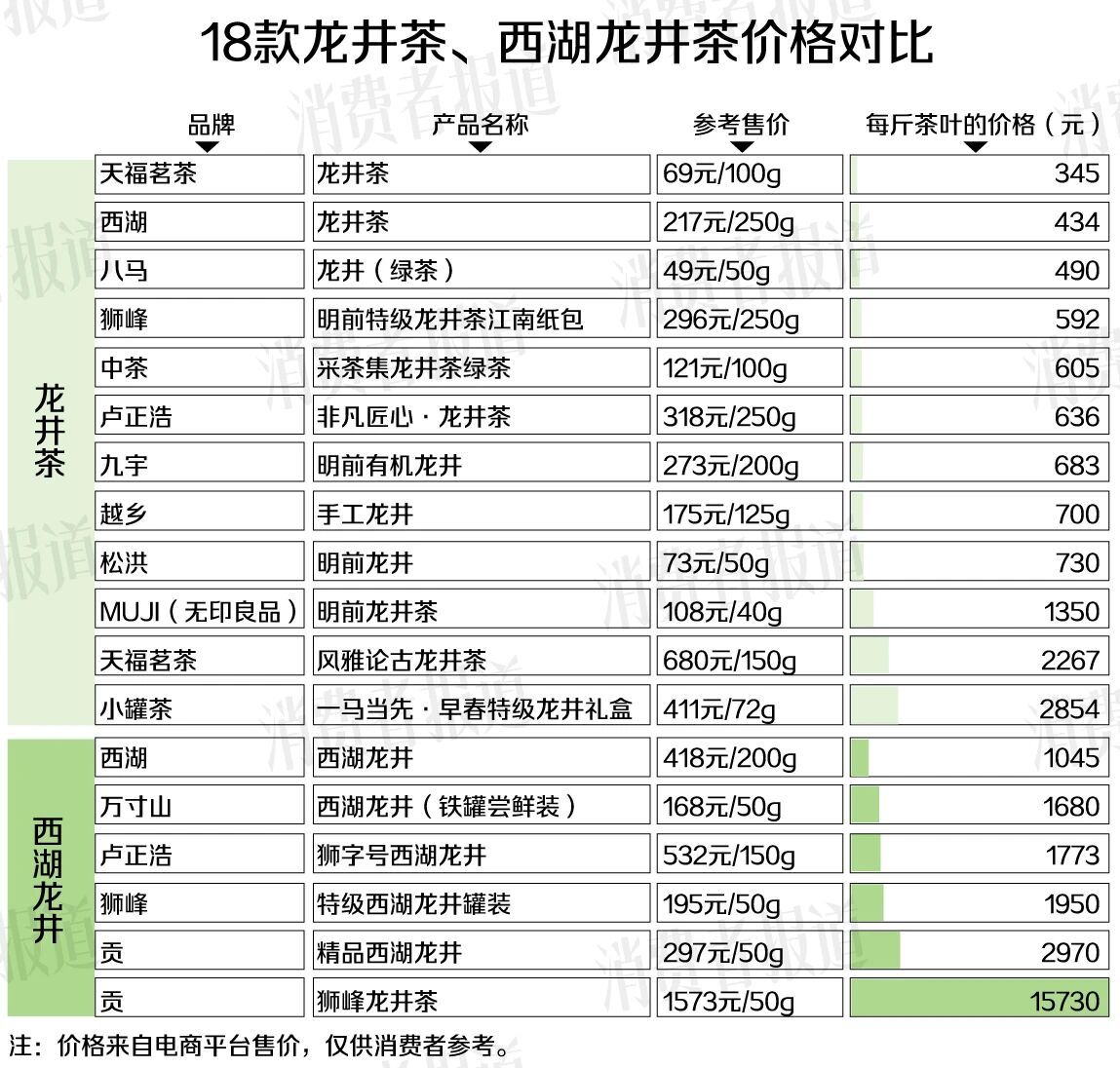 即便同为西湖龙井,差价也较为悬殊:价格最低的西湖西湖龙井(特级,1045元/斤)与价格最高的狮峰龙井茶(天赐珍品级,15730元)相差15倍。