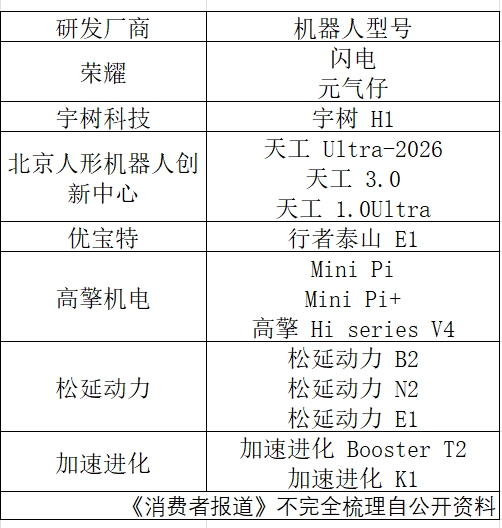 据《消费者报道》不完全统计,参赛的机器人产品包括宇树H1、天工1.0Ultra、闪电、松延动力B2、加速进化Booster T2、行者泰山等。