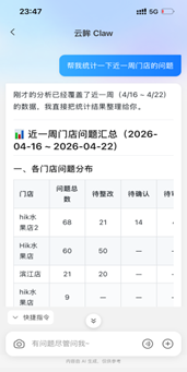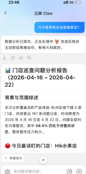 改变,首先落地在门店巡检场景。云眸Claw7×24小时在线,让门店管理从一次性抽查变为持续在线的常态化管理,从问题发现、任务下发、整改跟进、到数据复盘,全流程自驱动,让标准真正落地。不止于执行,云眸Claw还会主动筛选管理重点、预警关键问题。在徐哲涵看来,真正的“数字员工”,从不是被动等待指令,而是主动参与工作流,帮助做决策。更深层次的变化,在于管理方式变得更灵活了。自然语言成为交互界面后,管理者不再被预设的功能模块框住。无论是多维度综合巡检、还是临时调整核查重点——开口即有。徐哲涵把这种能力定义为“柔性”:让系统跟着管理意图走,而不是管理工作停下来等系统。云眸Claw的出现,推动门店管理系统从提供操作软件到提供“数字员工”,管理模式也迎来革新——既能筑牢标准化运营底线,也让动态需求能被灵活响应。徐哲涵表示,这位连锁行业的“数字员工”,当下是门店规范运营的助力,未来将持续进化,推动经营增长。