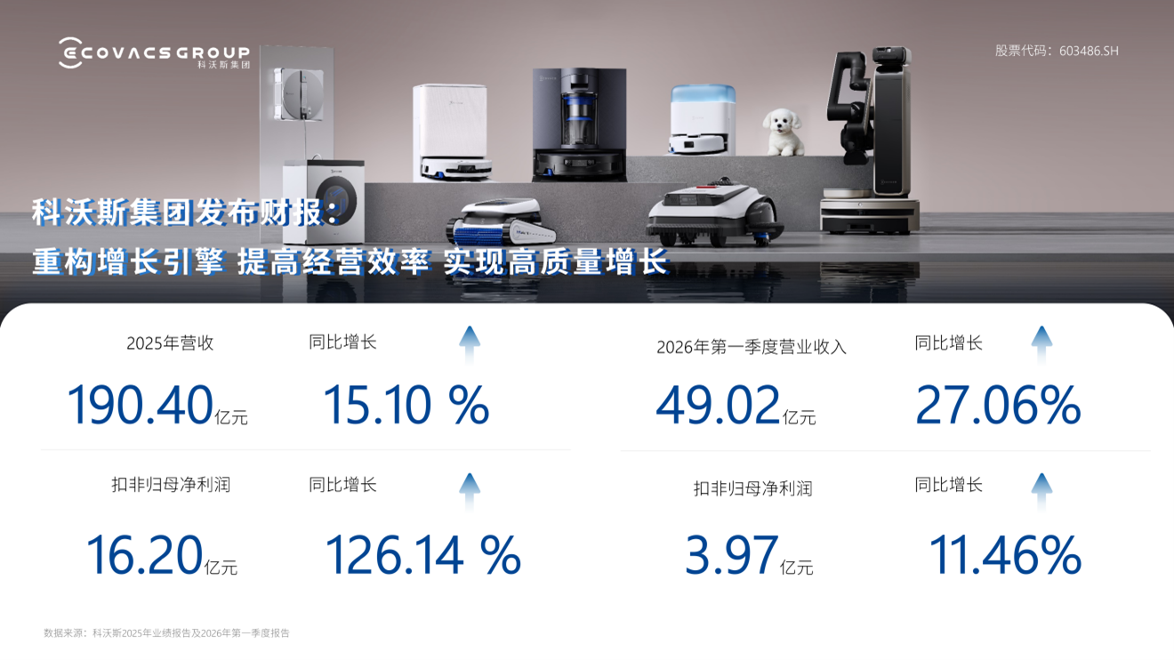 2026年4月24日晚,科沃斯集团(603486.SH)发布2025年度报告及2026年一季报。2025年公司实现营业收入190.40亿元,同比增长15.10%;归属于上市公司股东的净利润17.58亿元,同比大幅增长118.13%,扣非归属于上市公司股东的净利润16.20亿元,同比大幅增长126.14%。经营活动产生的现金流量净额达33.87亿元,同比大增297.39%。