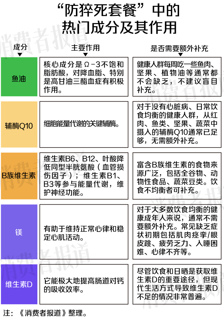而“防猝死套餐”中的鱼油、辅酶Q10、维生素D等多为保健食品,不具有治疗或预防的临床作用,可以食用但只能作为保健辅助,不能预防猝死,更不能治疗猝死。