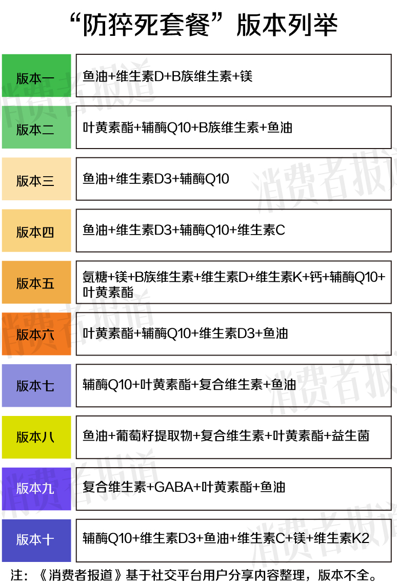 不过,所谓的“套餐”并没有统一配方。《消费者报道》记者发现,社交平台上的“防猝死套餐”版本众多,主要是消费者根据个人经验混合搭配的保健食品组合,常见的核心成分包括:鱼油、辅酶Q10、镁、B族维生素和维生素D等多种营养补充剂。有网友在社交平台上戏称:“只要每天吞下这一把药丸,就能在疯狂‘压榨’身体的同时,勉强逃过猝死的风险”。
