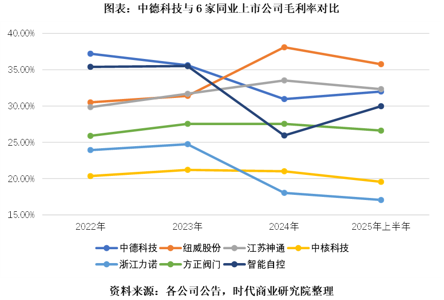 不过,时代商业研究院横向对比发现,2025年上半年,中德科技32.00%的综合毛利率处在可比上市公司平均线以上——低于纽威股份(35.76%)与江苏神通(32.33%),但高于中核科技(19.56%)、浙江力诺(17.06%)、方正阀门(26.62%)和智能自控(29.97%)。