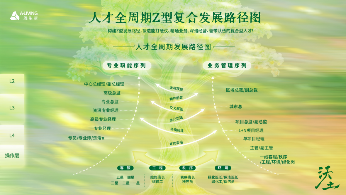 近日,雅生活集团“沃土计划”人才发展培养体系暨Z型复合发展路径正式焕新发布,不仅是公司内部一次人才体系的焕新,为未来组织发展根系重塑,走进改写物业行业格局的人才生态树背后的生长逻辑与落地之道。