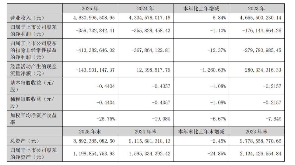 年报显示,2025年公司实现营业收入46.31亿元,同比增长6.85%;净亏损3.60亿元,亏损额同比扩大1.1%。