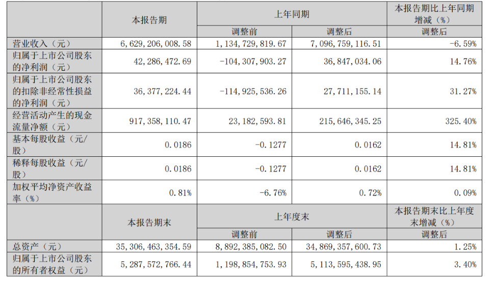 2026年第一季度,公司实现营业收入66.29亿元,较上年同期调整前营收增长近5倍,较调整后营收微降6.59%;实现归母净利润4228.65万元,同比增长14.76%(调整后)。