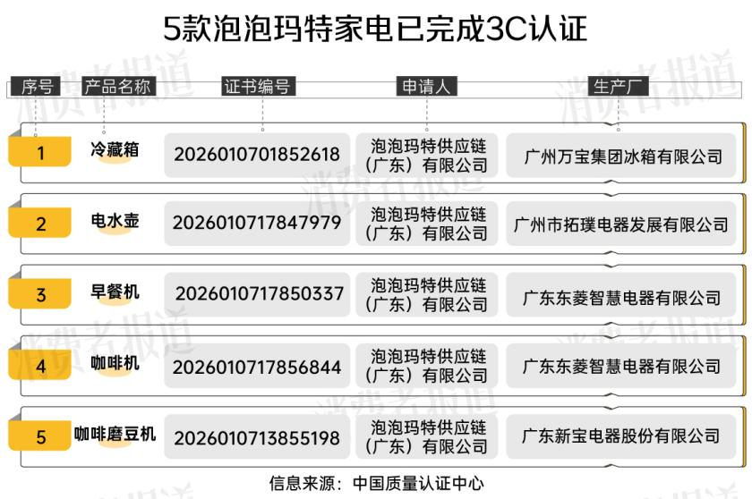 《消费者报道》在中国质量认证中心查询发现,泡泡玛特供应链(广东)有限公司已完成冷藏箱、电水壶、咖啡机、咖啡磨豆机、早餐机共5款家电产品的3C认证。
