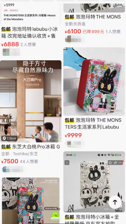 开售后,正如外界所料,两款LABUBU冰箱瞬间售罄。二手平台上,原价5999元的LABUBU冰箱大多被标上6999-9999元的转售价。