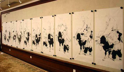 此案另一个辩论的焦点是“流水线作画”。被告郭庆祥说,他曾花200多万元订购了范曾200张画,拿到第一批画后,发现题材与技法严重雷同,像是一个模子里刻出来的。后来去范曾的画室看,发现范曾把10张宣纸挂在墙上,跟工厂生产线一样。对“流水线作画”,上海新文汇律师事务所的富敏荣律师出示了4张范曾流水式作画的照片。