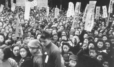 (图:1946年,上海的学生及工人举行集会,抗议美国对待中国的立场。美国政府并没有通知蒋介石由罗斯福签署的《雅尔塔协议》的相关内容。协议中对苏联作出了重要的让步,外蒙古从中国被分割出去,苏联在东北的特权曾于1905年被取消,如今却被重新承认,苏联人还被授权租借旅顺港的海军基地。)