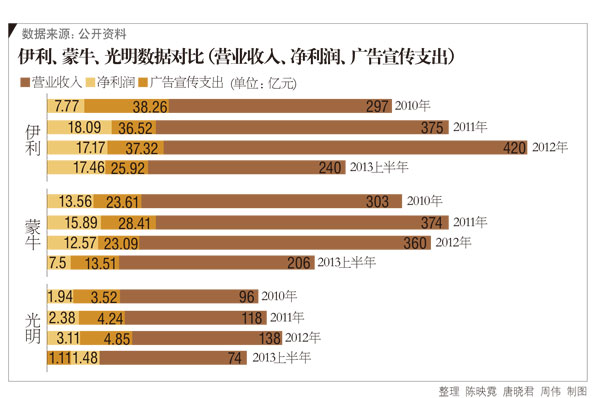 实际上,巨额营销费用已经成为奶业的一个通病。2011年,伊利一年广告和宣传支出占到了36.52亿元,平均每天1000多万。蒙牛、光明的广告费三大乳企去年全年合计达到69.16亿元,日均约1900万元。