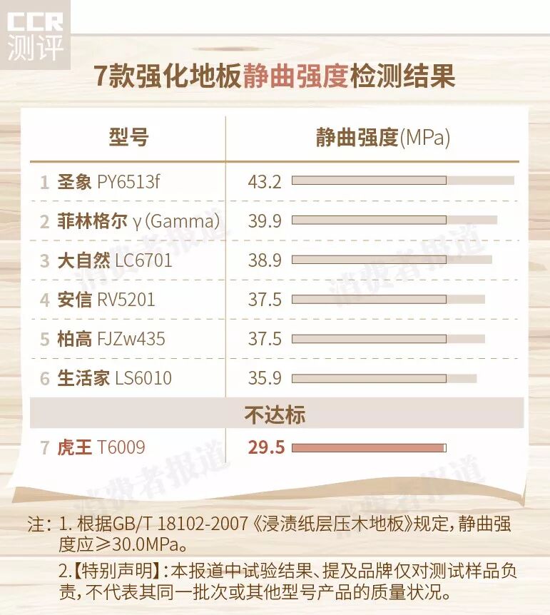 结果显示,1款虎王 T6009强化地板标称其执行了GB/T 18102-2007 《浸渍纸层压木地板》,但实际静曲强度检出为29.5 MPa,不满足标准要求。