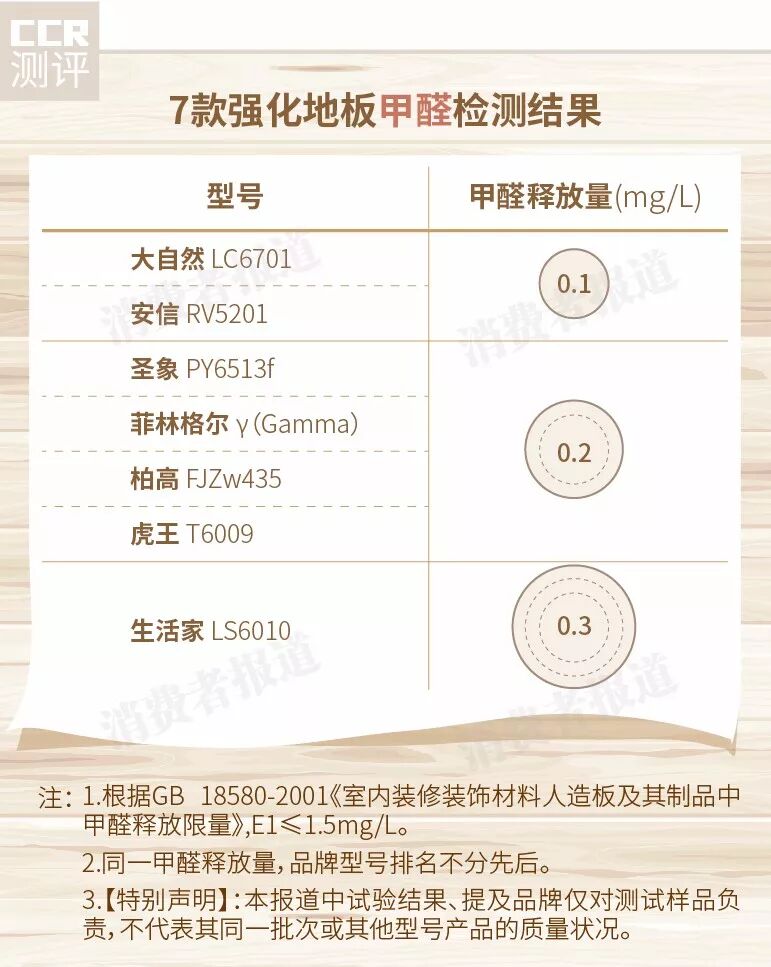 除了生活家,其他6款含量都在0.3mg/L以内。尤其是大自然、安信强化地板,含量仅为0.1mg/L,环保性能突出。