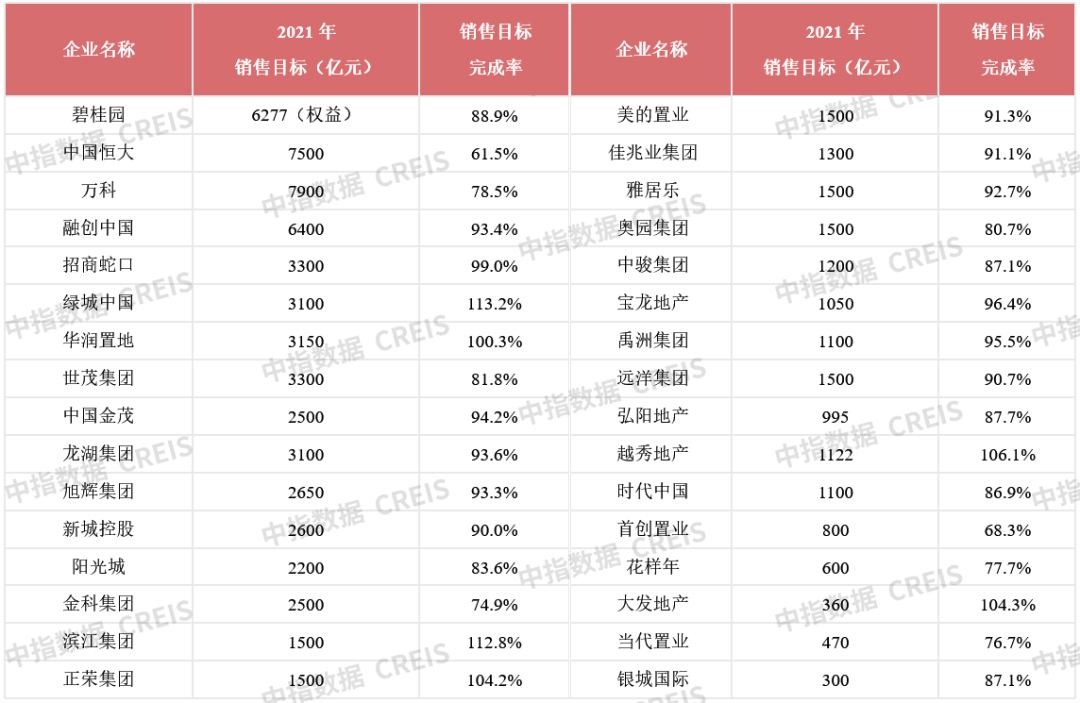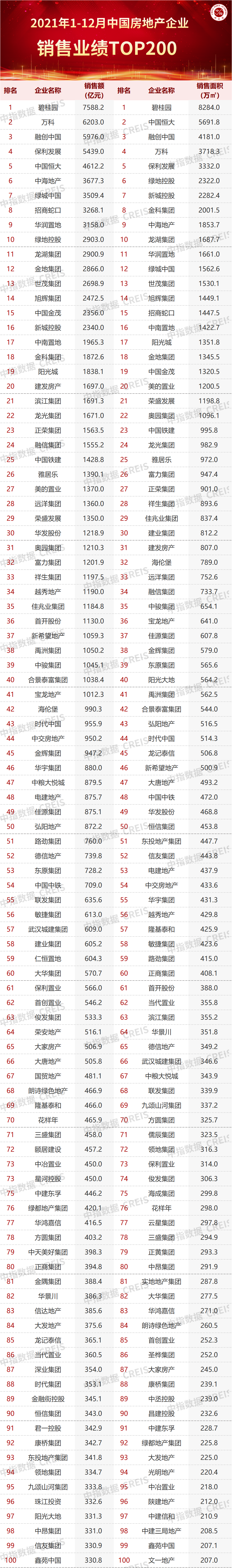 特别声明:房地产企业销售数据统计是以2021年1月1日-12月31日期间销售的并表商品房为统计口径,主要依据中指数据CREIS在各地的销售监测数据,并参考当期总体经营情况和推盘去化情况进行分析统计;对于少数没有在监测范围内的城市或项目,由企业提供相关证明文件,经课题组对数据进行严格审核,也纳入统计范围。本报告仅供参考,课题组不对使用报告及其内容所引发的任何直接或间接损失承担责任。