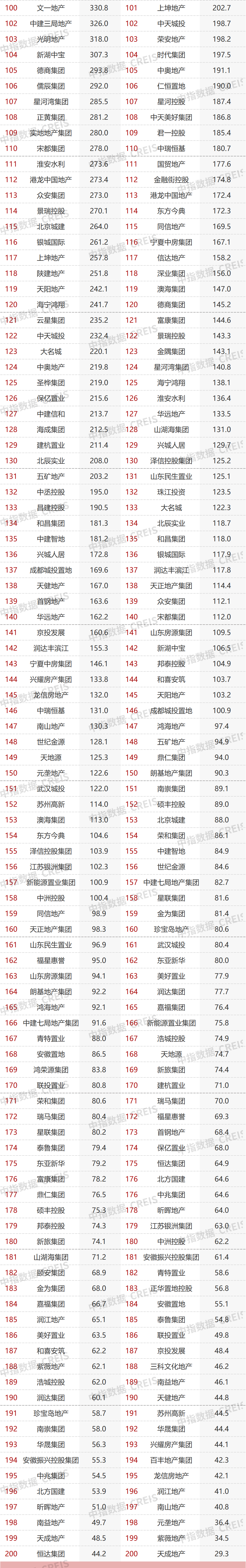 [1]研究组选取了碧桂园、恒大、万科、融创、保利、中海、绿地、世茂集团、华润置地、招商蛇口、龙湖、绿城、新城控股、金地、金茂、旭辉、金科、中南置地、阳光城、正荣、融信、龙光、富力、佳兆业、滨江、雅居乐、奥园、祥生、美的置业、远洋、蓝光发展、荣盛发展、新力、禹洲、中国铁建、华发、中骏、新希望、合景泰富、华夏幸福、首开、越秀、时代中国、金辉、佳源、弘阳、大悦城、仁恒、华宇、宝龙共计50家百亿代表企业作为研究对象。