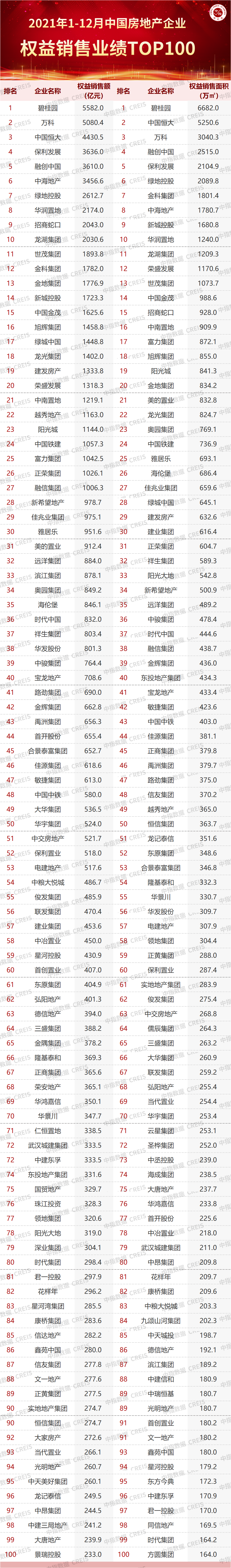 特别声明:房地产企业权益销售数据统计是以2021年1月1日-12月31日期间按股权比例销售的商品房为统计口径,主要依据中指数据CREIS在各地的销售监测数据,并参考当期总体经营情况和推盘去化情况进行分析统计;对于少数没有在监测范围内的城市或项目,由企业提供相关证明文件,经课题组对数据进行严格审核,也纳入统计范围。本报告仅供参考,课题组不对使用报告及其内容所引发的任何直接或间接损失承担责任。