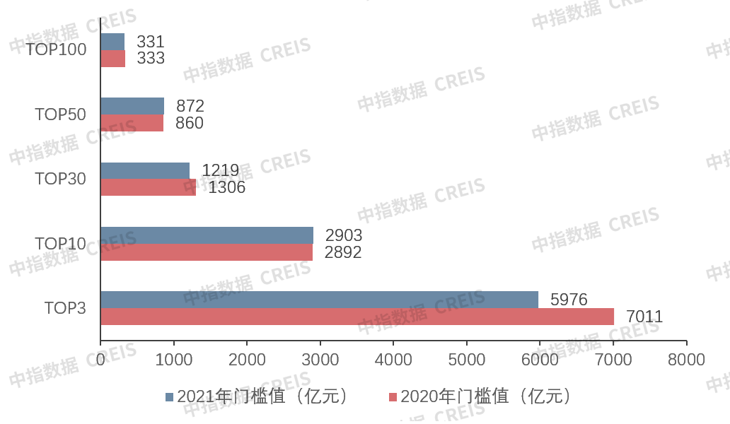 2021年1-12月,TOP3房企门槛值为5976.0亿元,较上年下降14.8%;TOP10房企门槛值为2903.0亿元,较上年增长0.4%;TOP30房企门槛值为1218.9亿元,较上年下降6.7%;TOP50房企门槛值872.2亿元,较上年增长1.4%;TOP100房企门槛值为330.8亿元,较上年下降0.7%。