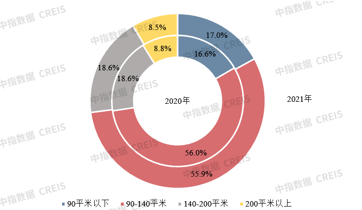刚需类需求持续释放。研究组对50家百亿代表企业2020年及2021年重点项目各面积段的销售额贡献分析得出:50家百亿代表企业的90平方米以下首置型产品销售额占比为17%,同比增加0.4个百分点,刚需类需求持续释放;90-140平方米改善产品和200平米以上产品的销售额占比分别为55.9%和8.5%,同比分别下降0.1和0.3个百分点;140-200平方米改善产品的销售额占比与去年持平。
